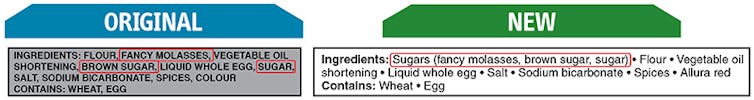 One such proposal is to group all types of sugar together in the ingredients list. At present, ingredients are listed in order of quantity. To avoid sugar being listed first, the food industry uses different types of sugars in processed foods such as sugar, corn syrup, molasses and brown sugar. Under the new regulations, these sugars would be listed together as one ingredient.